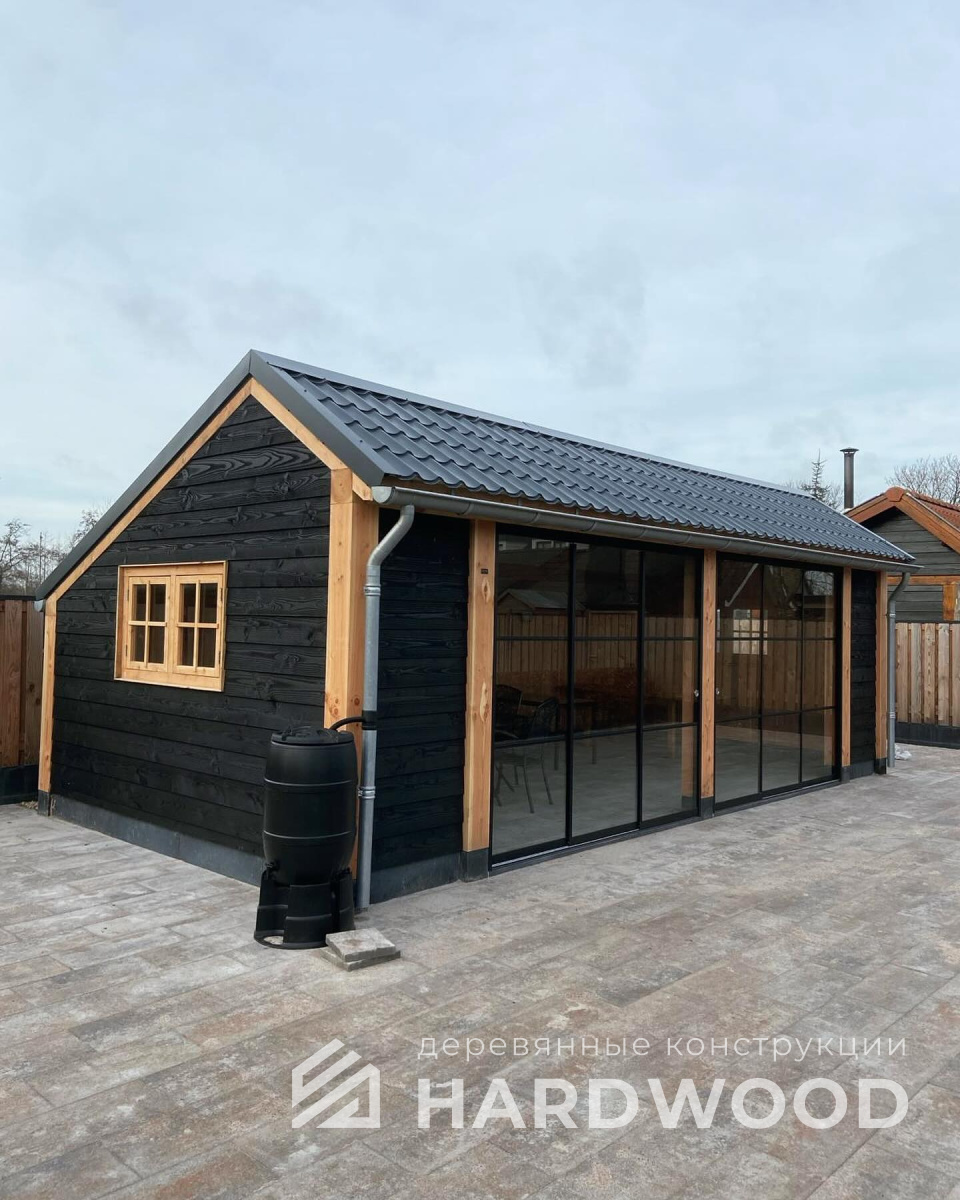 Лофт вырос из индустриальной эстетики: прямые линии, понятный каркас, фактура материалов на первом плане. В беседке это выражается в открытых балках, строгой геометрии, крупном остеклении и функциональности каждой детали. Никакой визуальной «тяжести» — только то, что работает на комфорт и стиль.